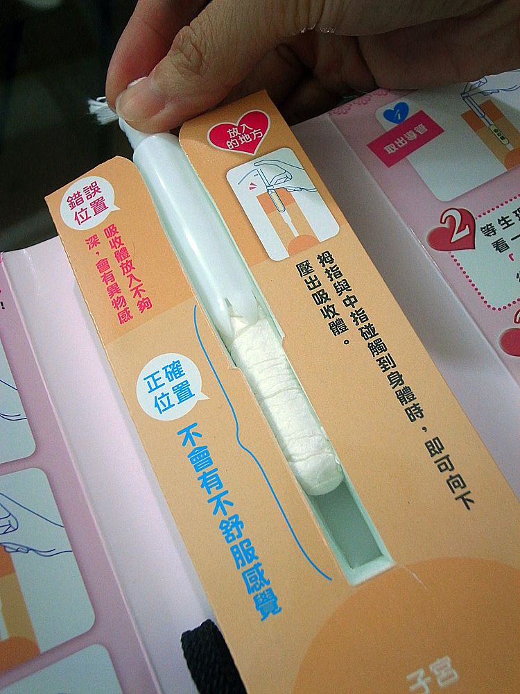 我第一次試根本放不進去 XD 搞了老半天還是浪費了一條。第二次聽從說明書建議洗完澡試,導管是放進去了,但推棉條的時候推不進去,反而把導管推出體外。之後試了幾次,雖然很努力的固定導管不動,但推棉條時都覺得裡頭緊到會痛,所以沒辦法推得很到位,也不知道是太緊張還是太笨…