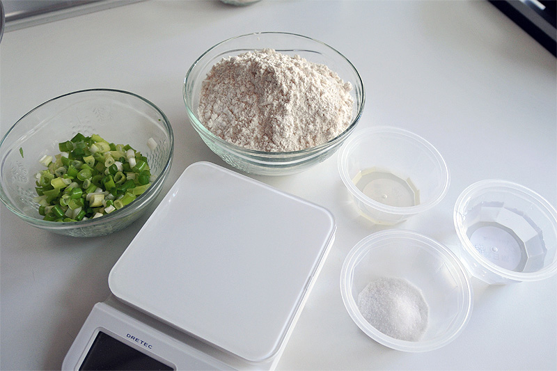 ▼ 蔥放一天給它乾後就可以開始備料了,先秤好麵粉、沙拉油、鹽、冷水,沒有秤的話也不用擔心,可以看表自行換算體積。