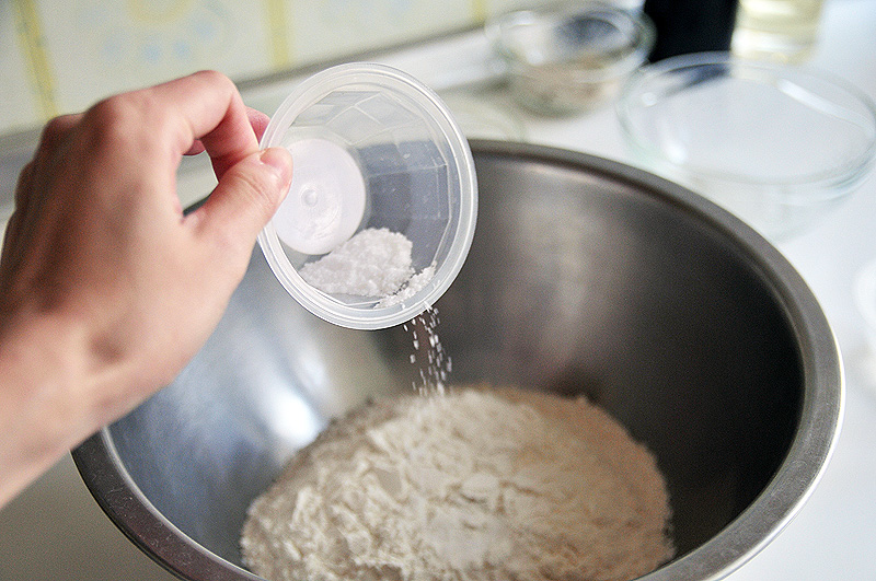 ▼ 做蔥油餅要先燙麵,先將麵粉和鹽混合均勻,懶得洗手就用筷子拌。烘培用的寬口打蛋盆很好用,洗菜、做蛋糕、揉麵都超好用!