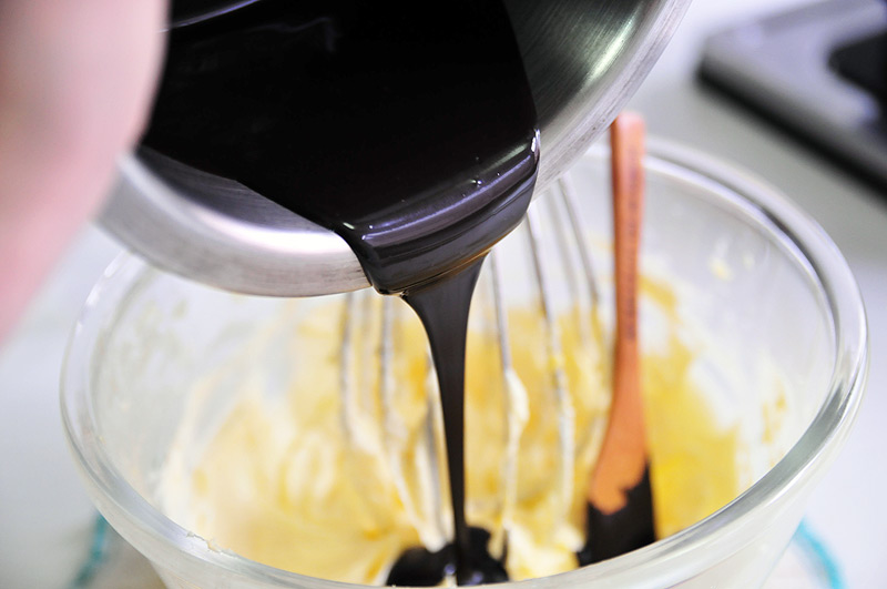 ▼ 加入已經融完了的苦甜巧克力後拌一拌。(打蛋器和刮刀可以交替著用,剛下材料時用刮刀感覺會比較好拌。)
