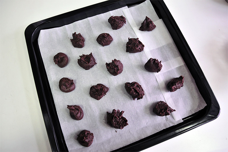 ▼ 因為不是麵團沒辦法用手捏,得拿兩根湯匙稍微弄成一坨一坨排在烤盤上,麵糊烤了會攤平,所以一定要留足夠的間距,不然烤完會片片相連到天邊…排好後烤箱也預熱好了,就可以進烤箱了!約烤16分鐘。